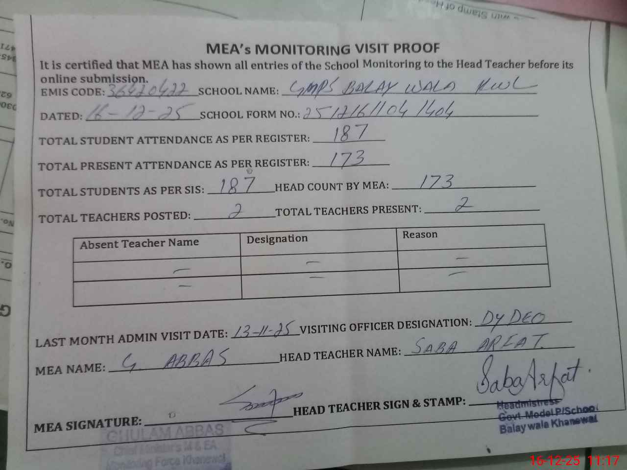 | EMIS Code: 36420422 | Name of School: GMPS BALAY WALA, KHANEWAL | |||