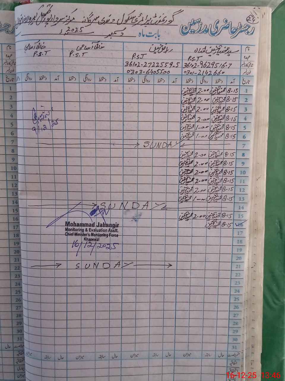| District: KHANEWAL | Tehsil: KABIRWALA | Markaz: SARDAR PUR - MALE | Level: Primary | |