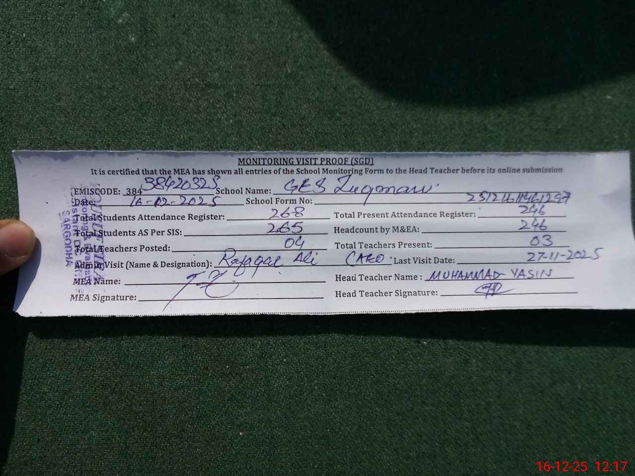 | Attendance Register | Head Teacher | MEA with School | Visit Proof |