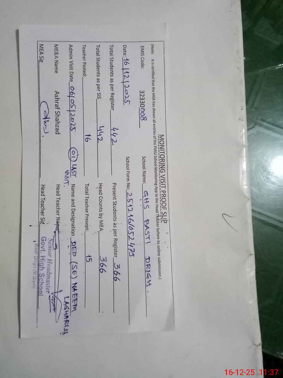 | Attendance Register | Head Teacher | MEA with School | Visit Proof |