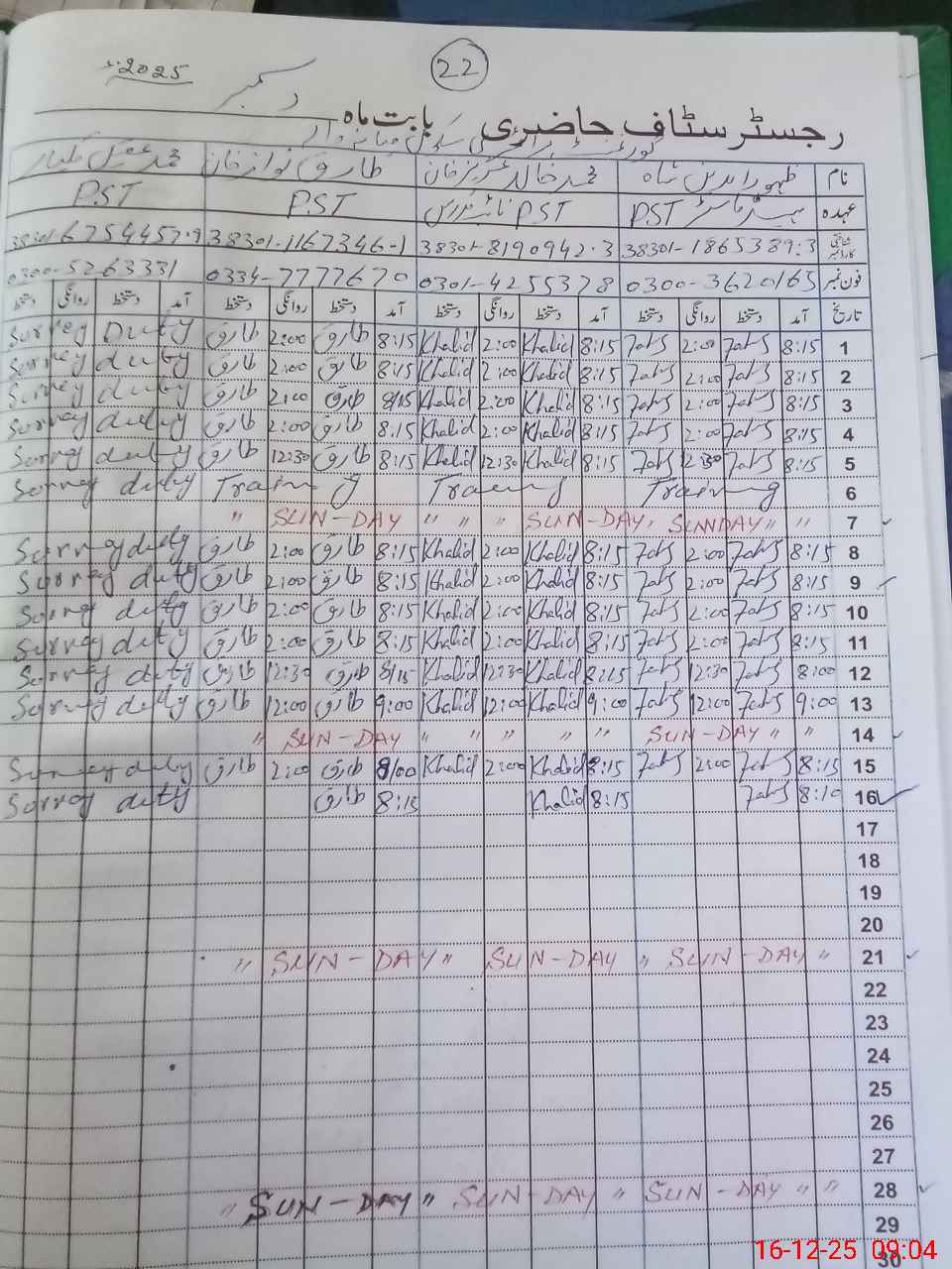 | CNIC | Full Name | Designation | R/C | Absence During Last Calender Month |
