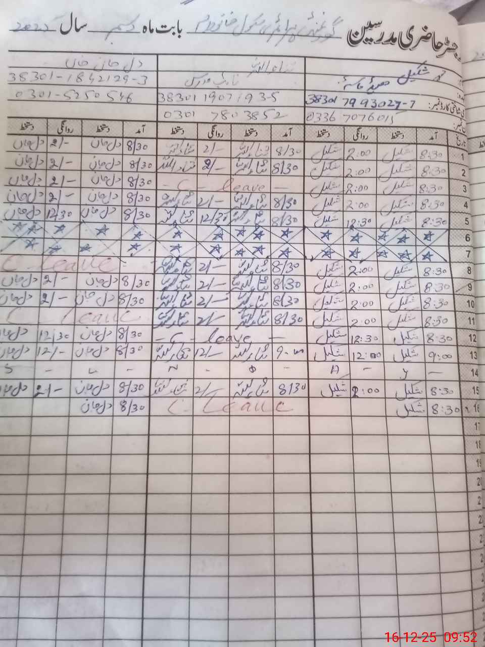| CNIC | Full Name | Designation | R/C | Absence during last cal. month |