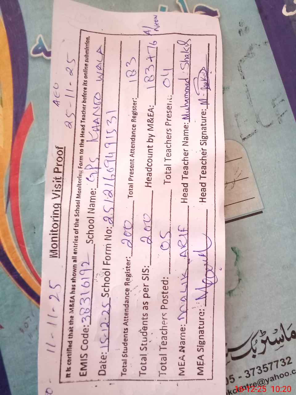 | Attendance Register | Head Teacher | MEA with School | Visit Proof |