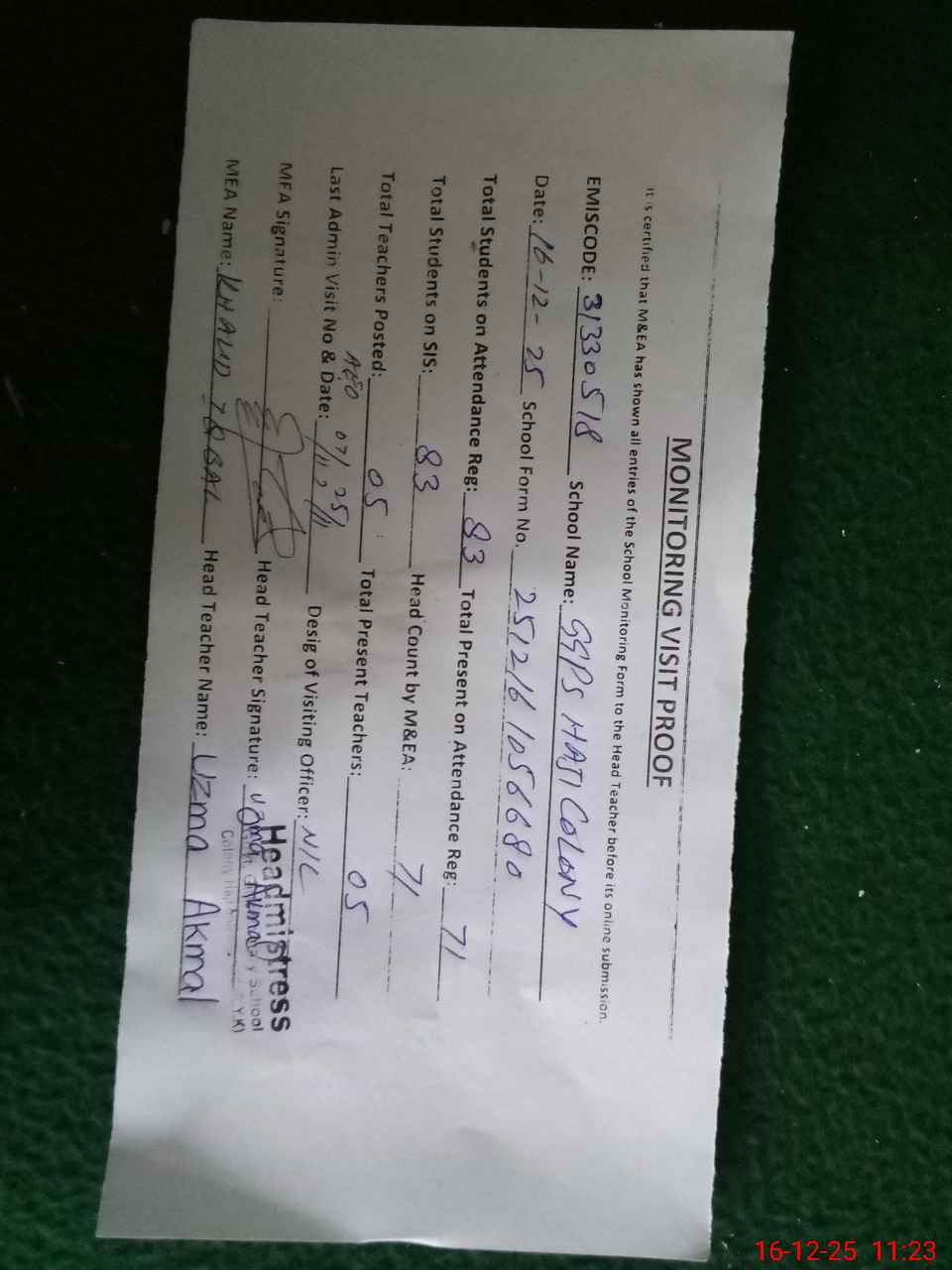 | Attendance Register | Head Teacher | MEA with School | Visit Proof |