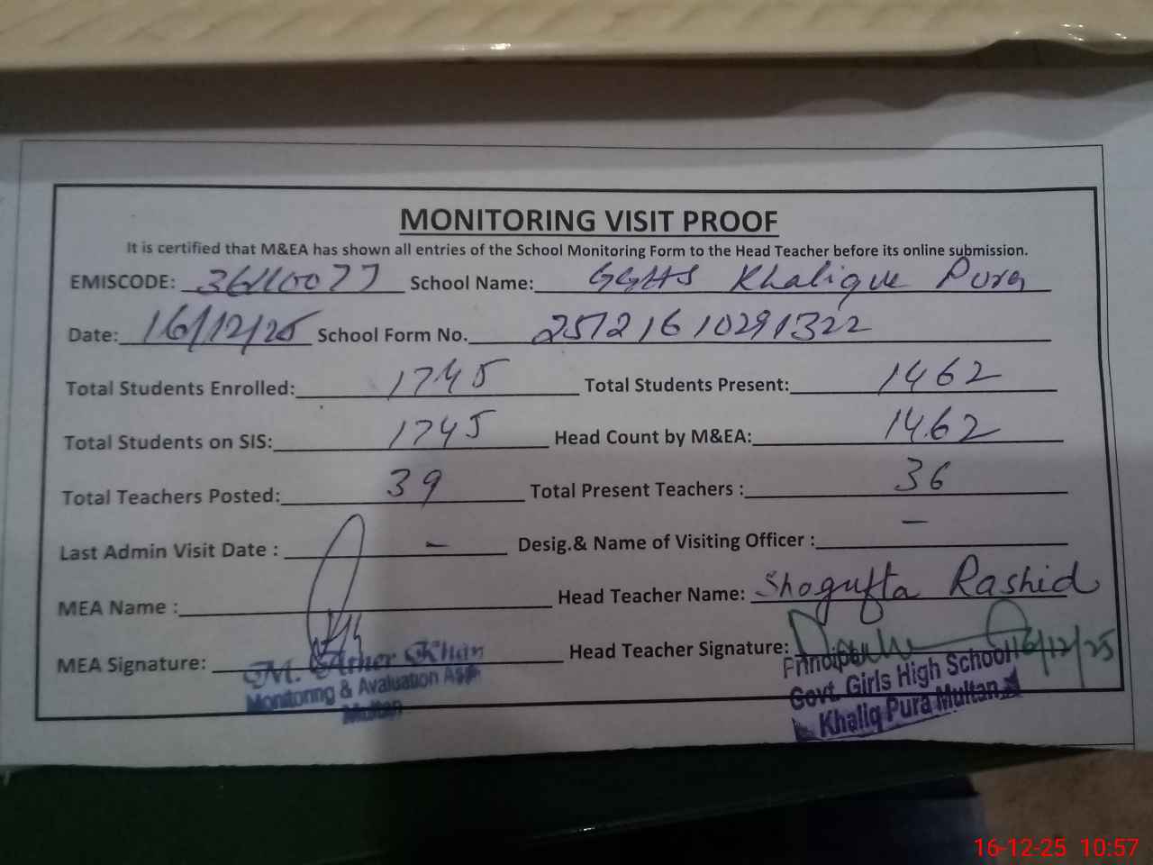 | EMIS Code: 36110077 | Name of School: GGHS KHALIQUE PURA KHALIQUE PURA | |||