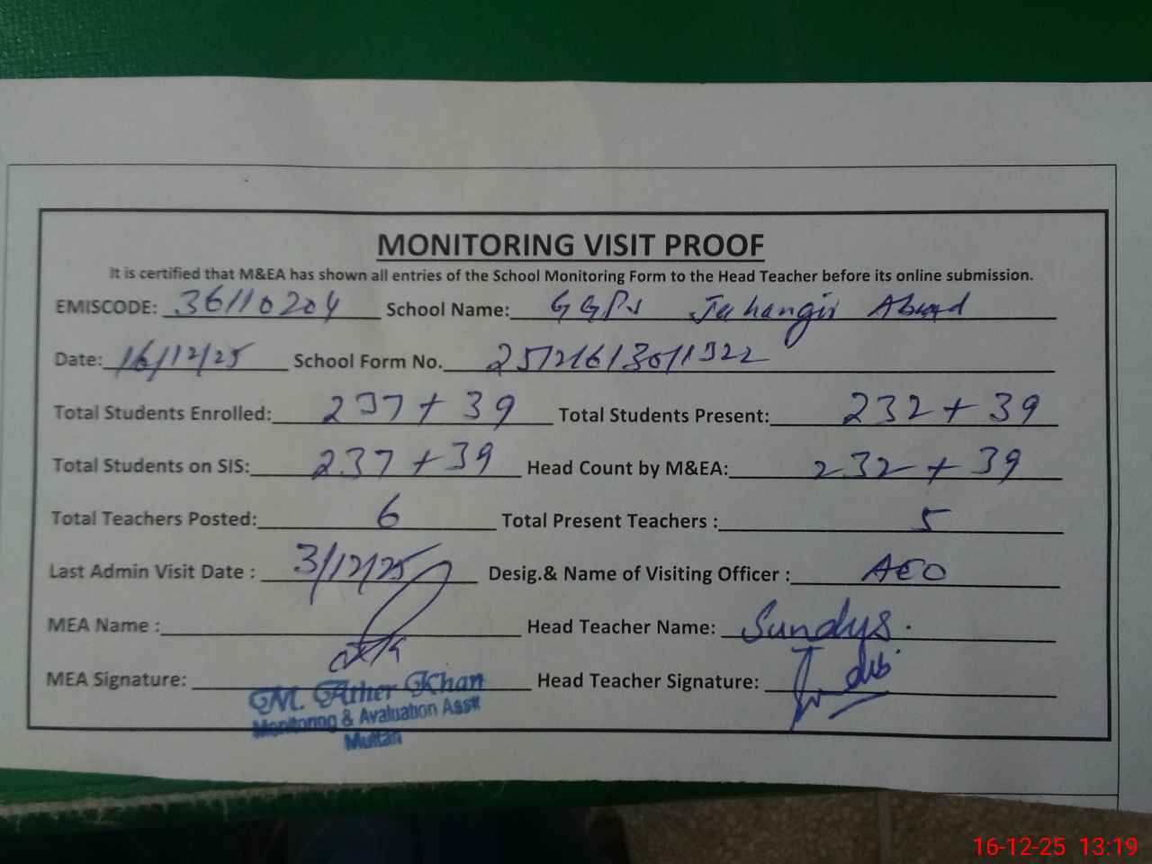 | EMIS Code: 36110204 | Name of School: GGPS JAHANGIR ABAD MULTAN | |||