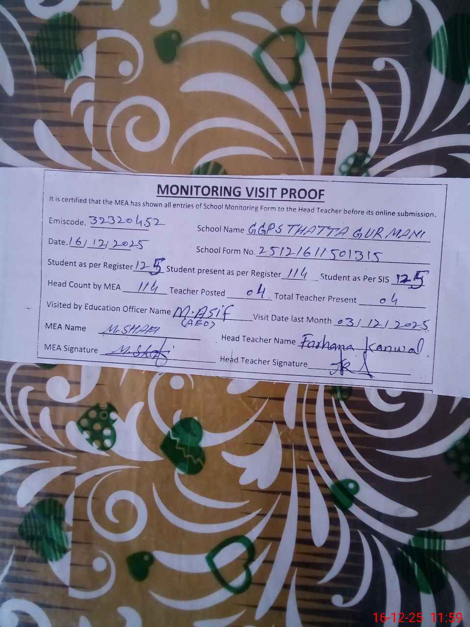 | EMIS Code: 32320452 | Name of School: GGPS THATTA GURMANI | |||