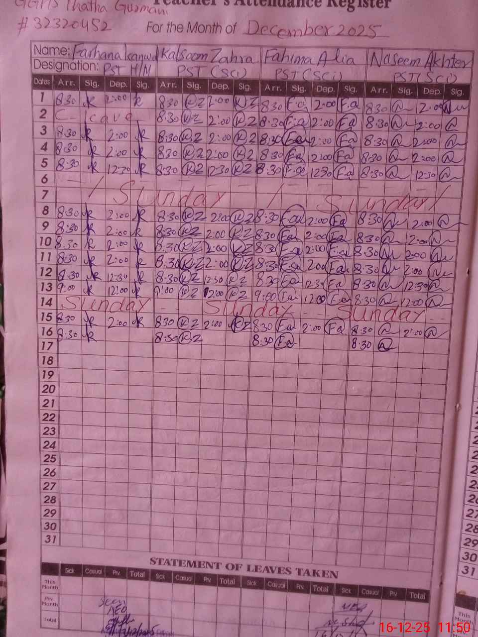 | CNIC | Full Name | Designation | R/C | Absence During Last Calender Month |