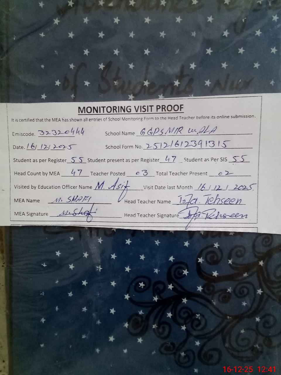 | EMIS Code: 32320444 | Name of School: GGPS MIR WALA | |||