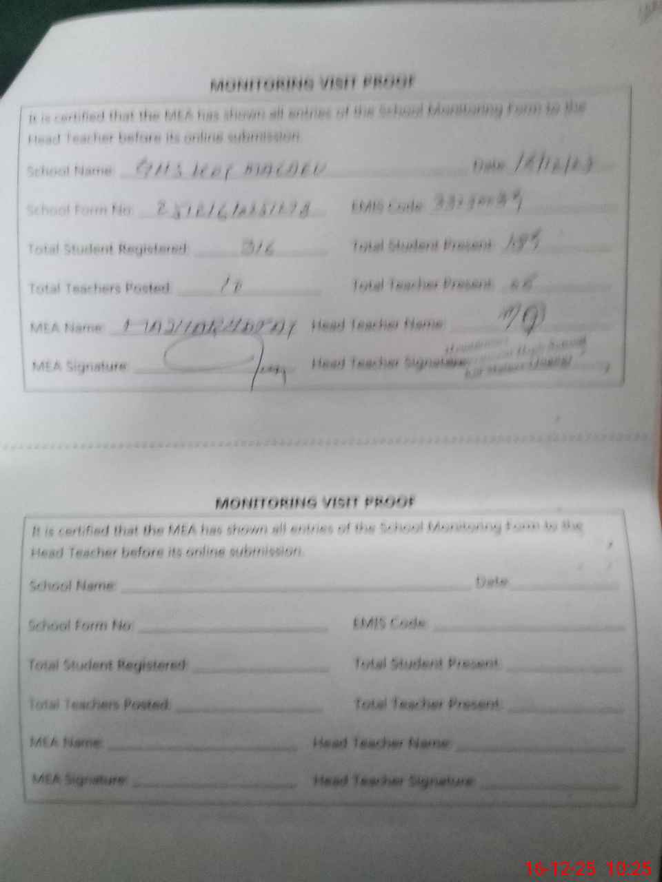 | Attendance Register | Head Teacher | MEA with School | Visit Proof |
