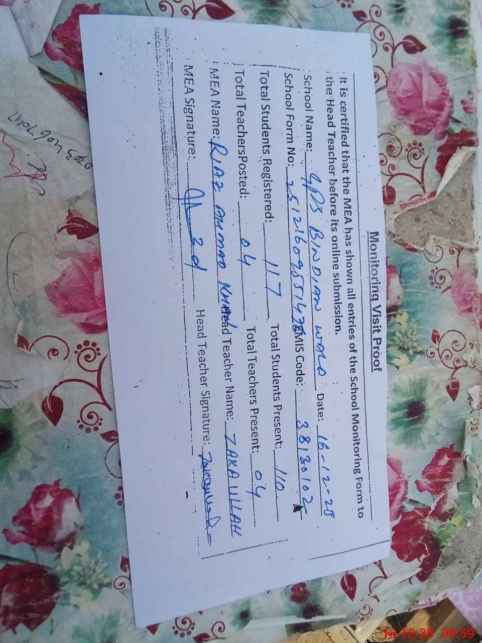 | EMIS Code: 38130102 | Name of School: GPS BINDIAN WALA | |||