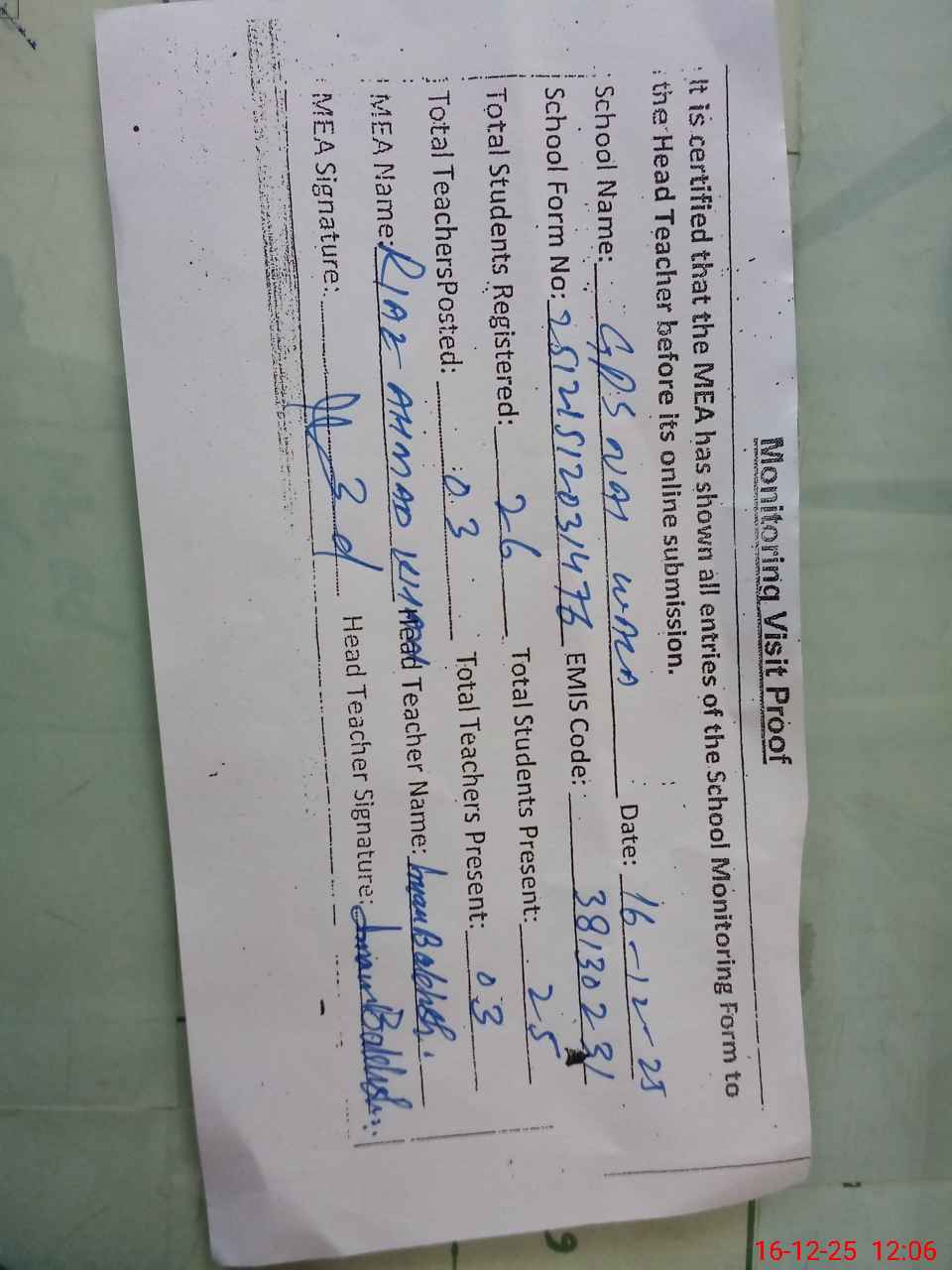 | EMIS Code: 38130231 | Name of School: GPS NAI WALA | |||