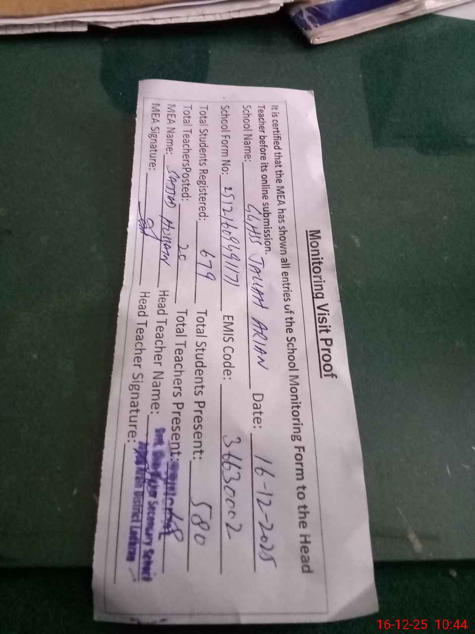 | Attendance Register | Head Teacher | MEA with School | Visit Proof |