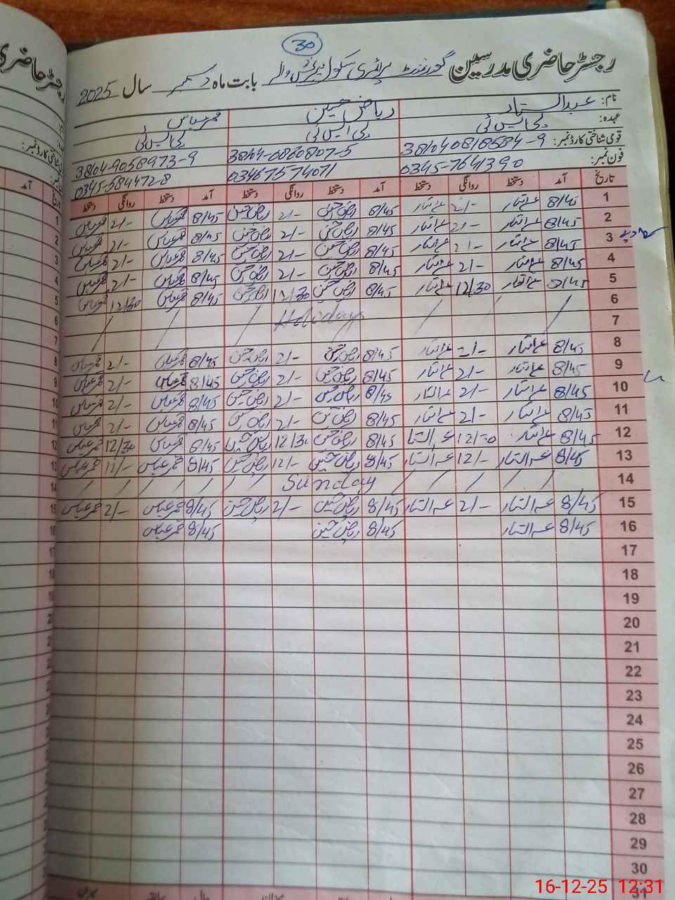 | CNIC | Full Name | Designation | R/C | Absence During Last Calender Month |
