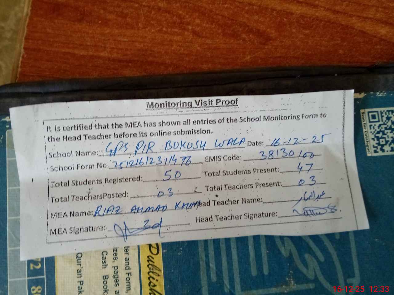 | Attendance Register | Head Teacher | MEA with School | Visit Proof |