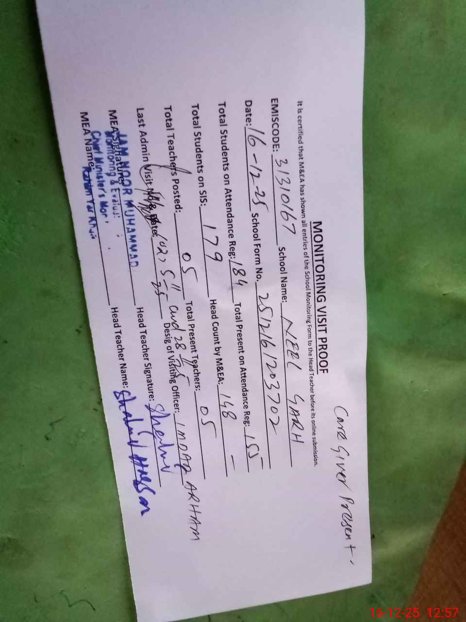 | Attendance Register | Head Teacher | MEA with School | Visit Proof |