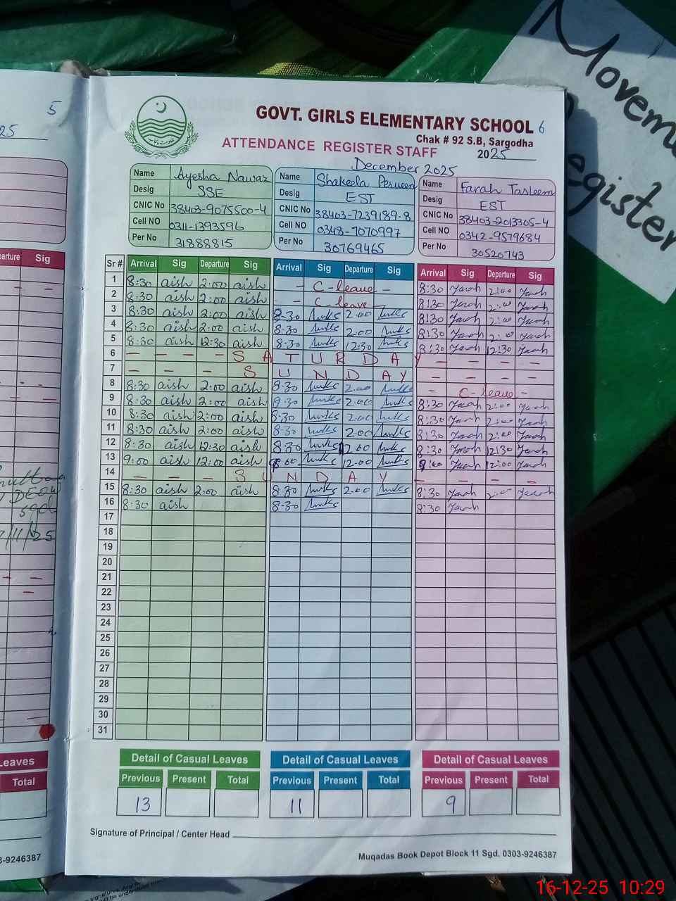 | CNIC | Full Name | Designation | R/C | Absence During Last Calender Month |