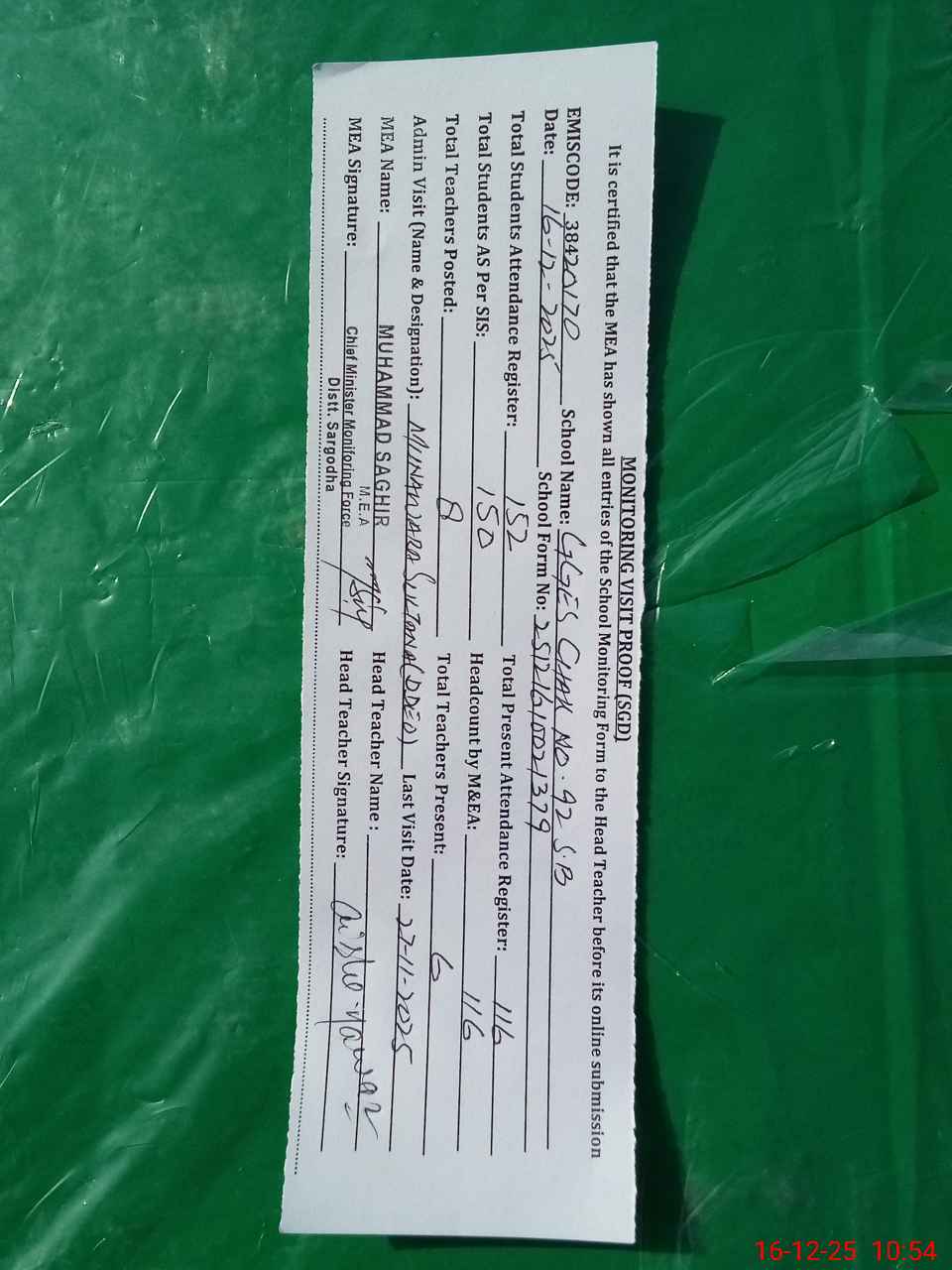 | Attendance Register | Head Teacher | MEA with School | Visit Proof |