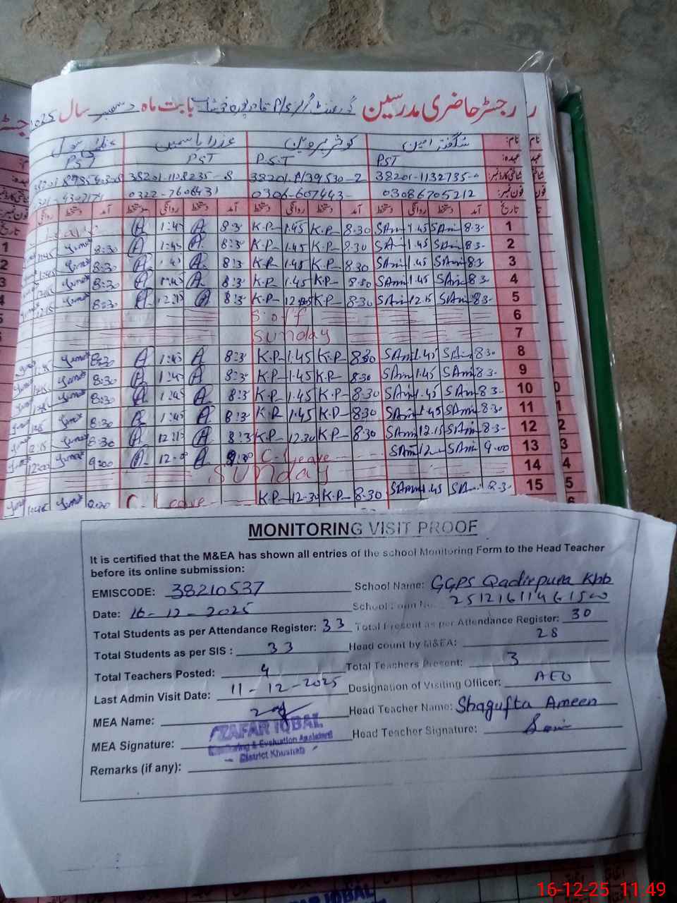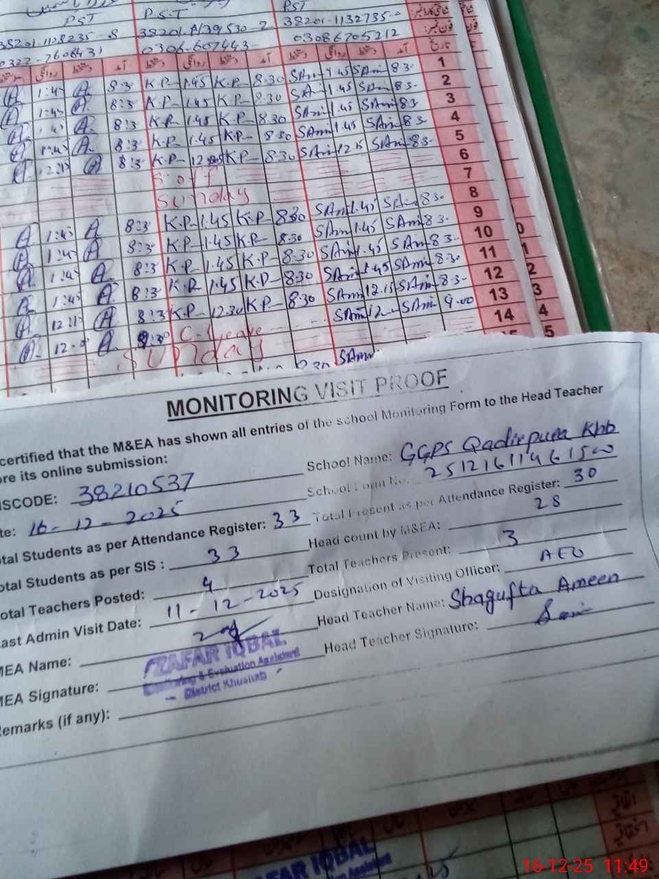 | Attendance Register | Head Teacher | MEA with School | Visit Proof |