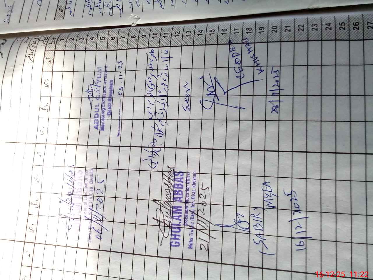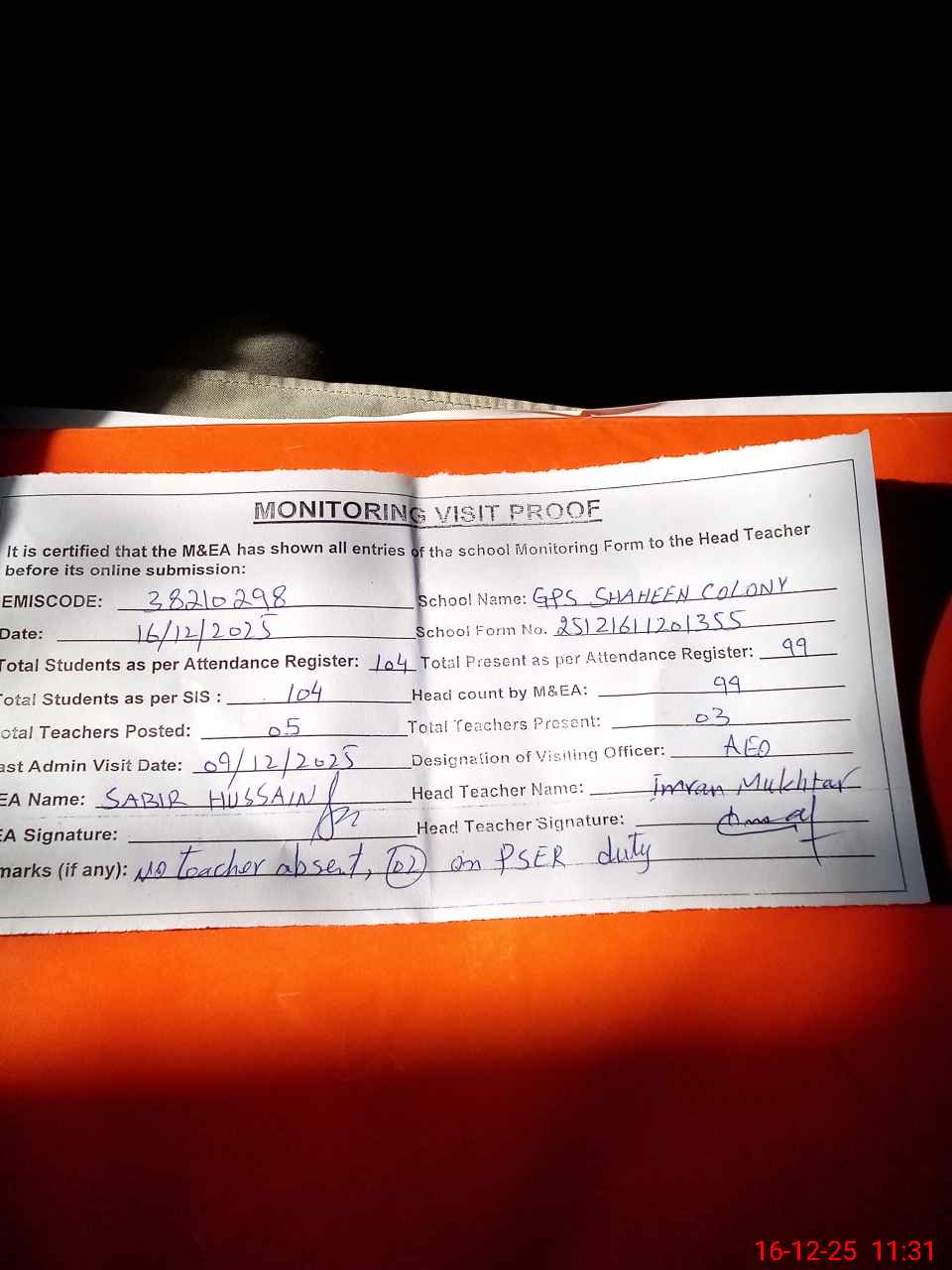 | Remarks (Use Separate Page if Required): no teacher absent total students on register 104 total students on SiS 104 present students are 99 last admin visit by AEO 09 Dec 2025 | |||||