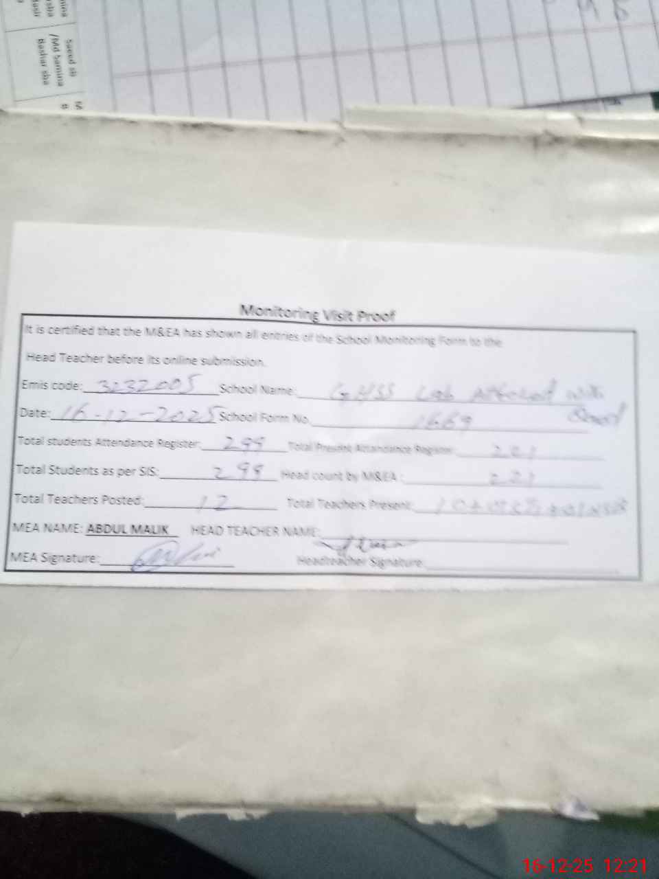 | EMIS Code: 32320059 | Name of School: GHSS Lab. (ATTACH WITH QAED) KOT ADU | |||