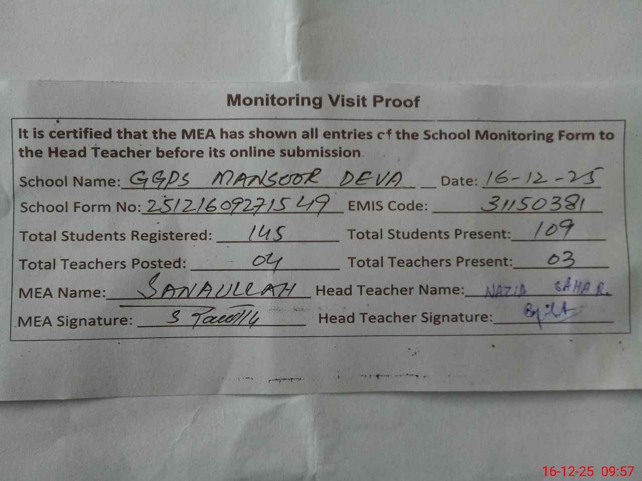 | EMIS Code: 31150381 | Name of School: GGPS MANSOOR DIVA | |||