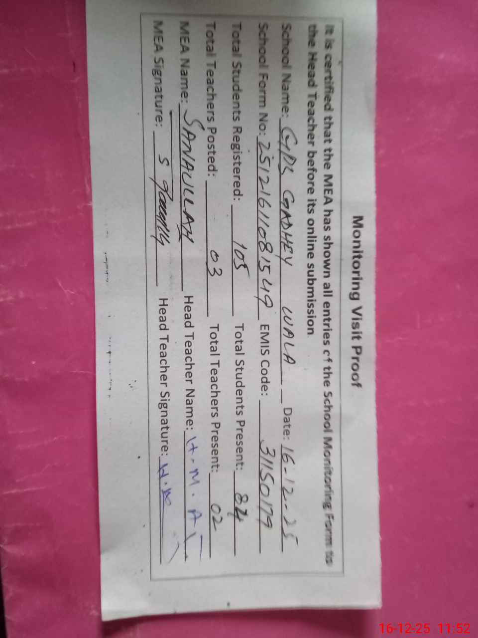 | EMIS Code: 31150179 | Name of School: GPS GADHEY WALA | |||