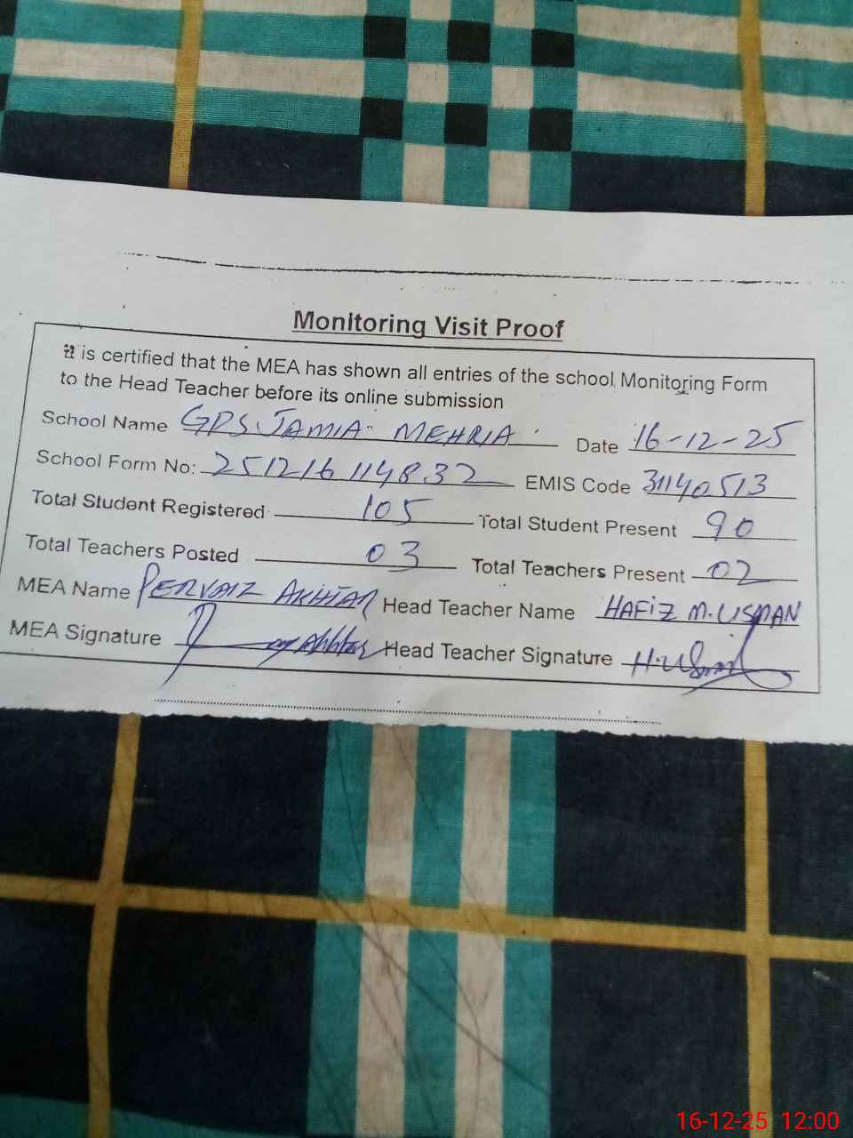 | Attendance Register | Head Teacher | MEA with School | Visit Proof |