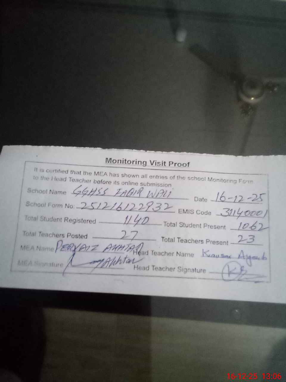 | Attendance Register | Head Teacher | MEA with School | Visit Proof |