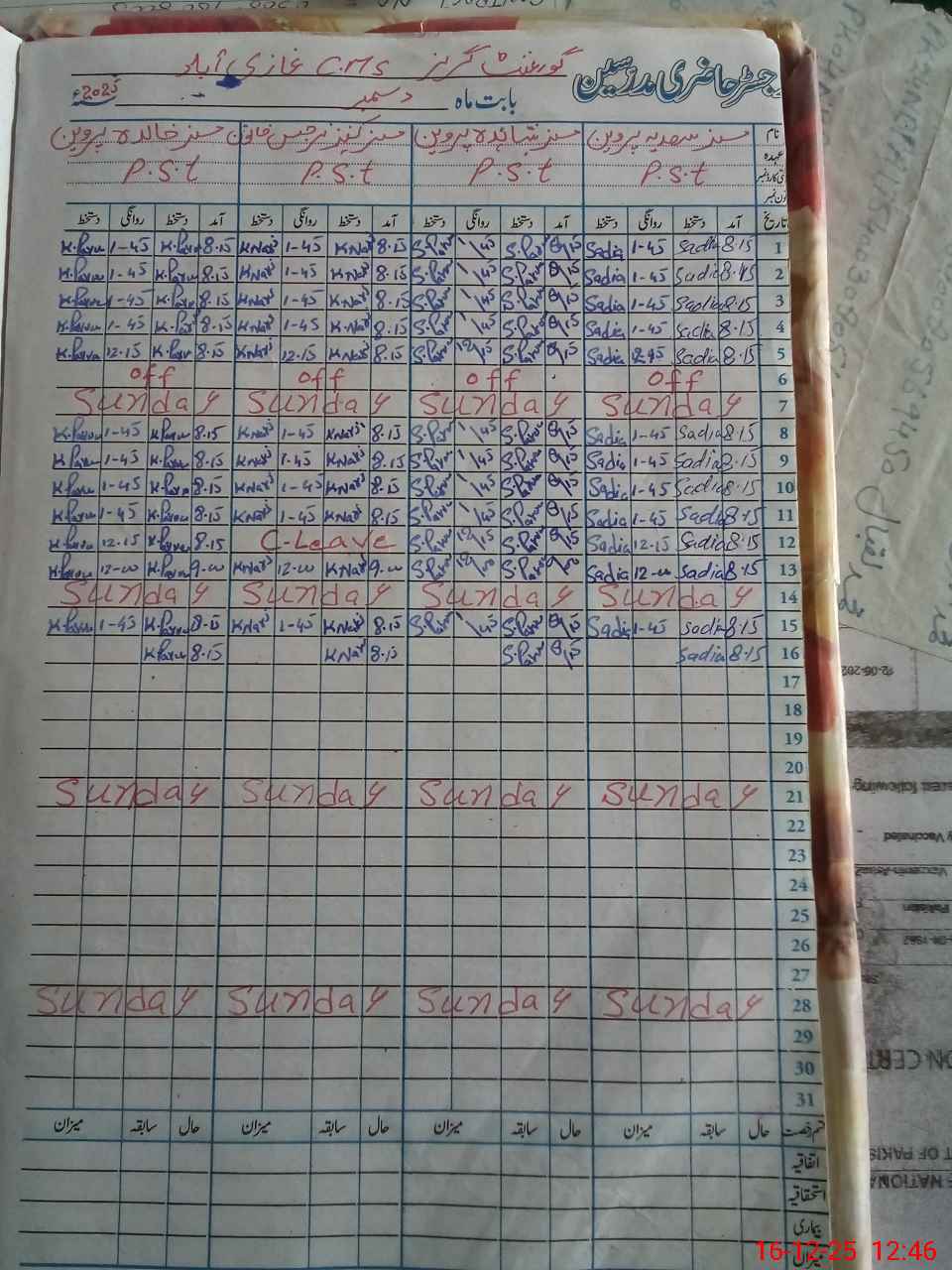| CNIC | Full Name | Designation | R/C | Absence During Last Calender Month |