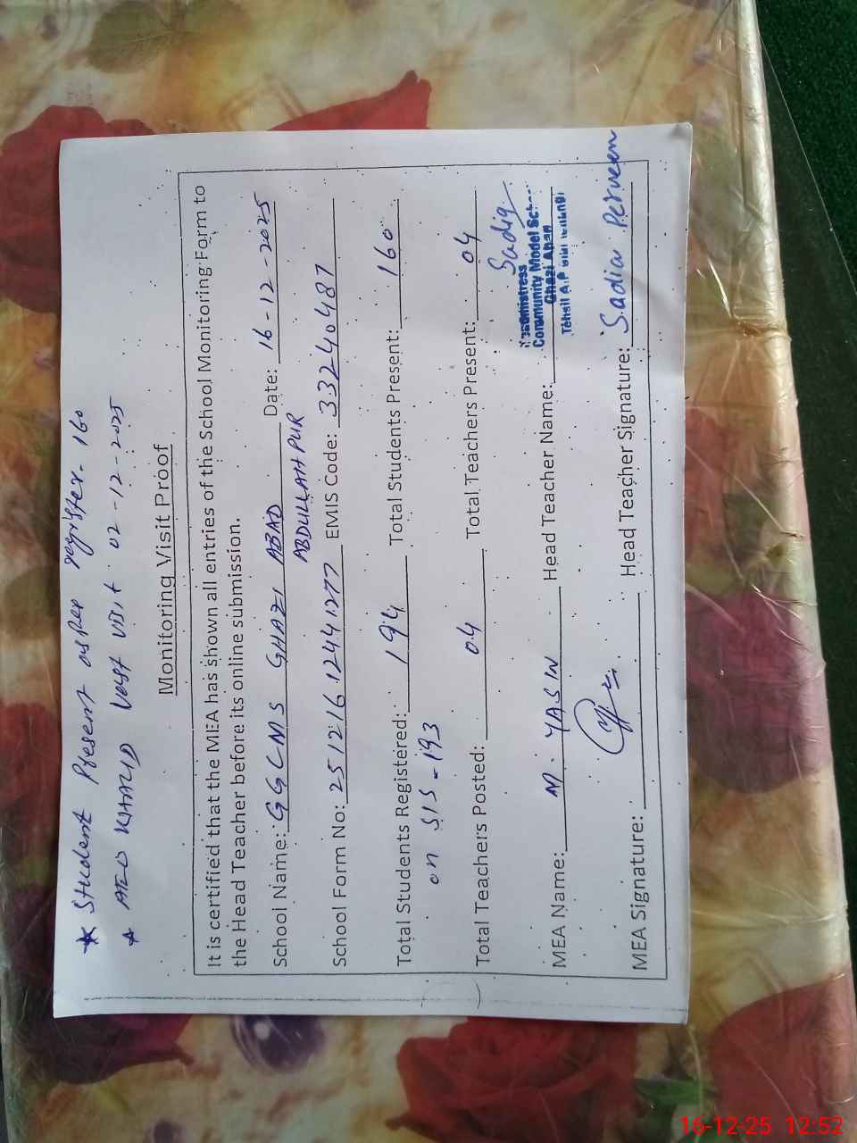 | Attendance Register | Head Teacher | MEA with School | Visit Proof |