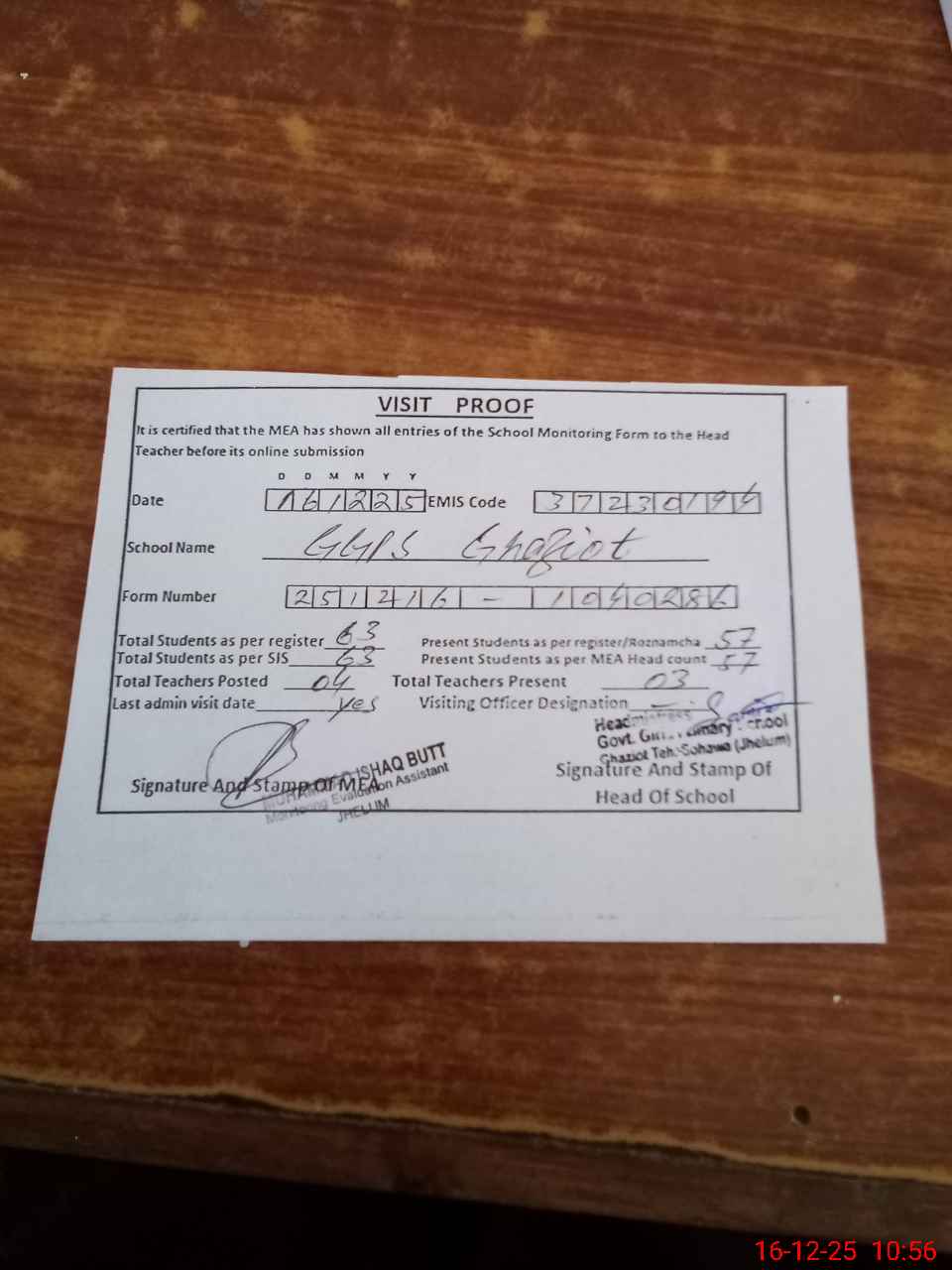 | Attendance Register | Head Teacher | MEA with School | Visit Proof |