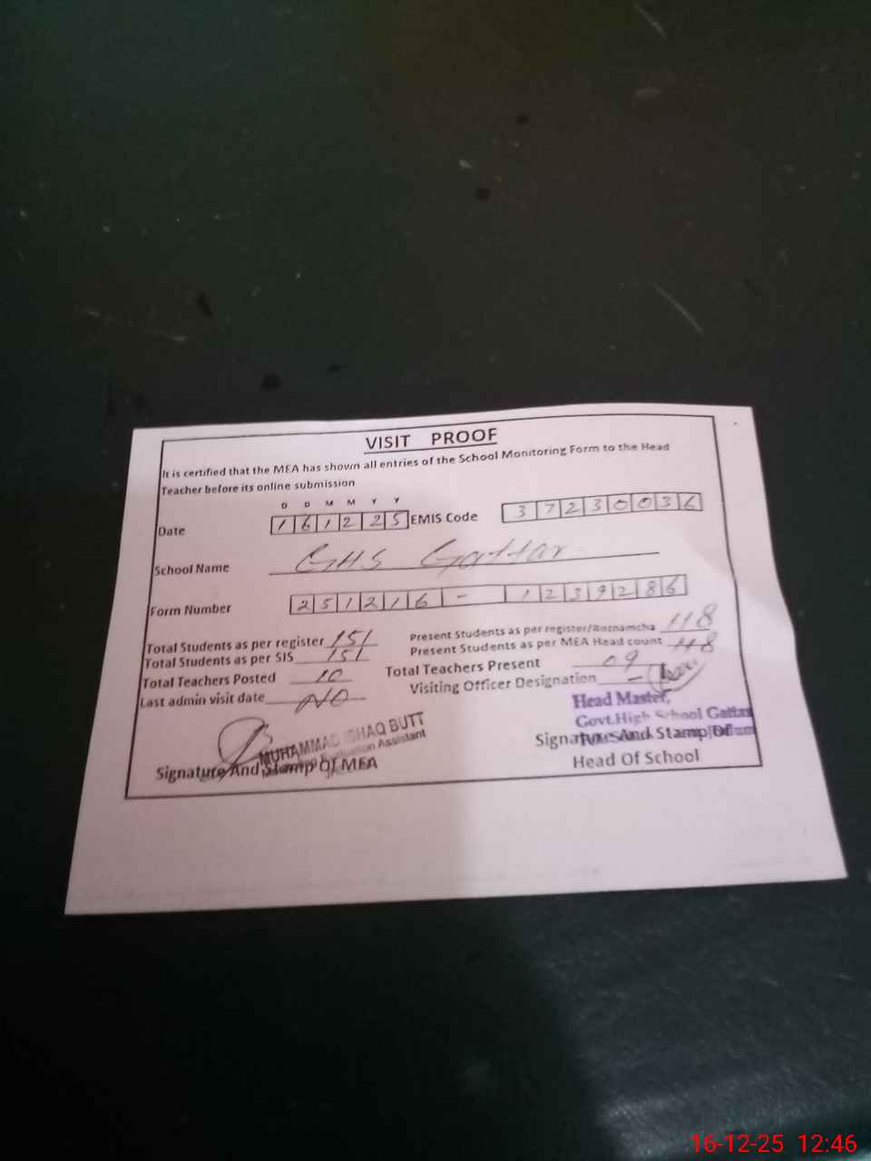 | Attendance Register | Head Teacher | MEA with School | Visit Proof |