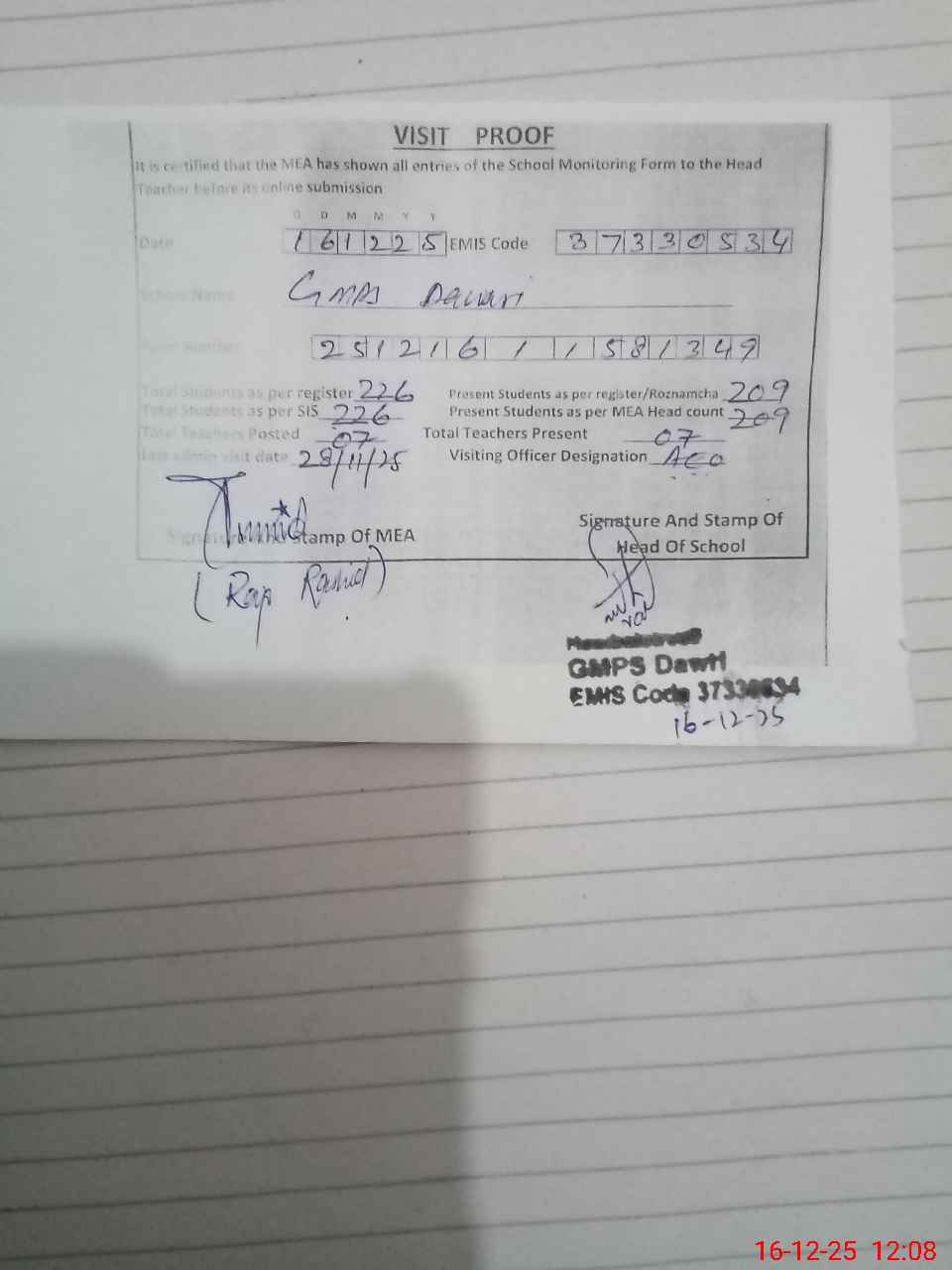 | Certified that this School was Inspected by the Undersigned MEA/DMO Today and the Information Stated Above is as Per Record. | |||||