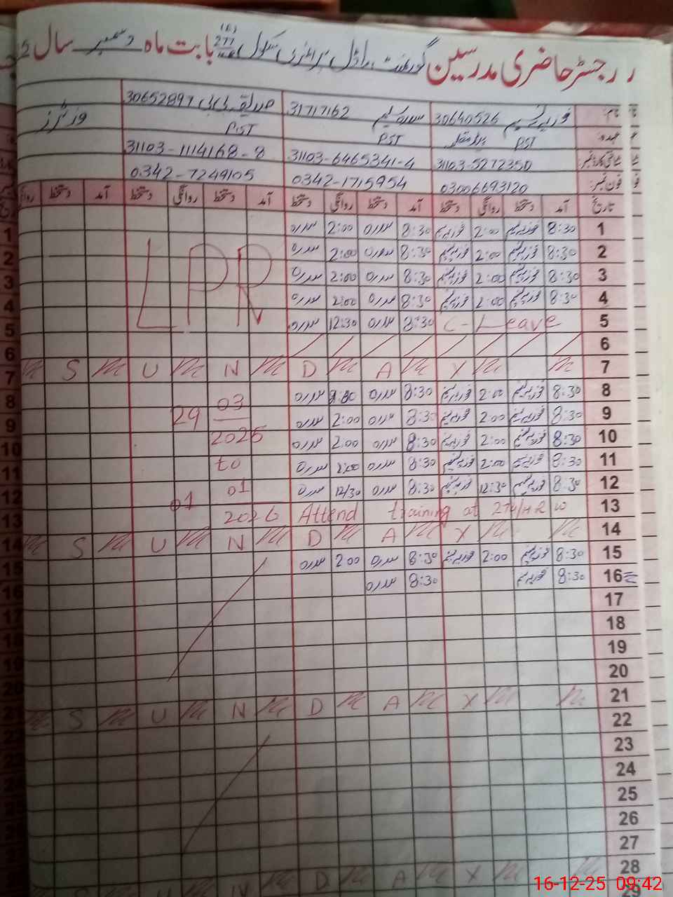 | CNIC | Full Name | Designation | R/C | Absence During Last Calender Month |