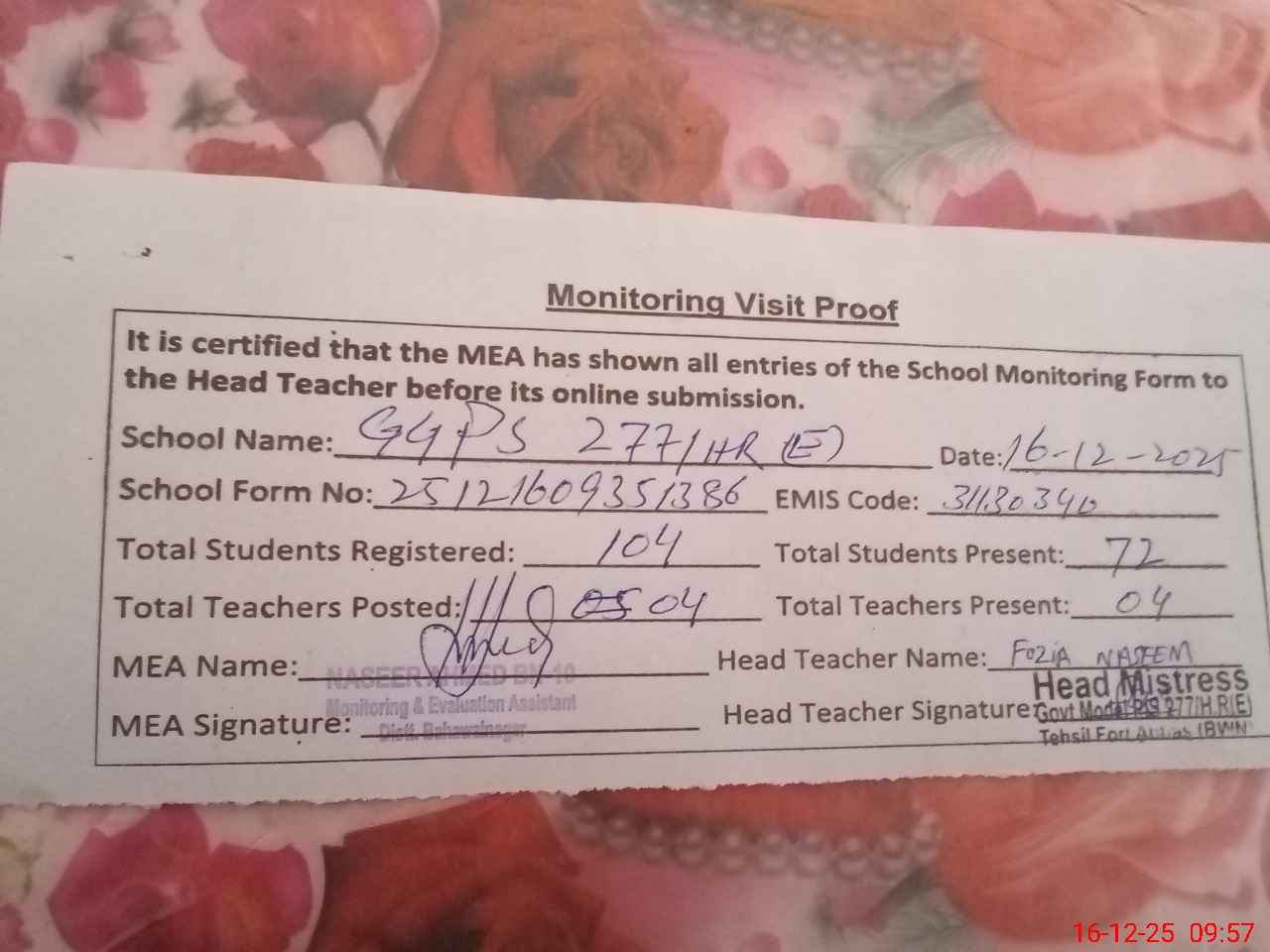 | Attendance Register | Head Teacher | MEA with School | Visit Proof |