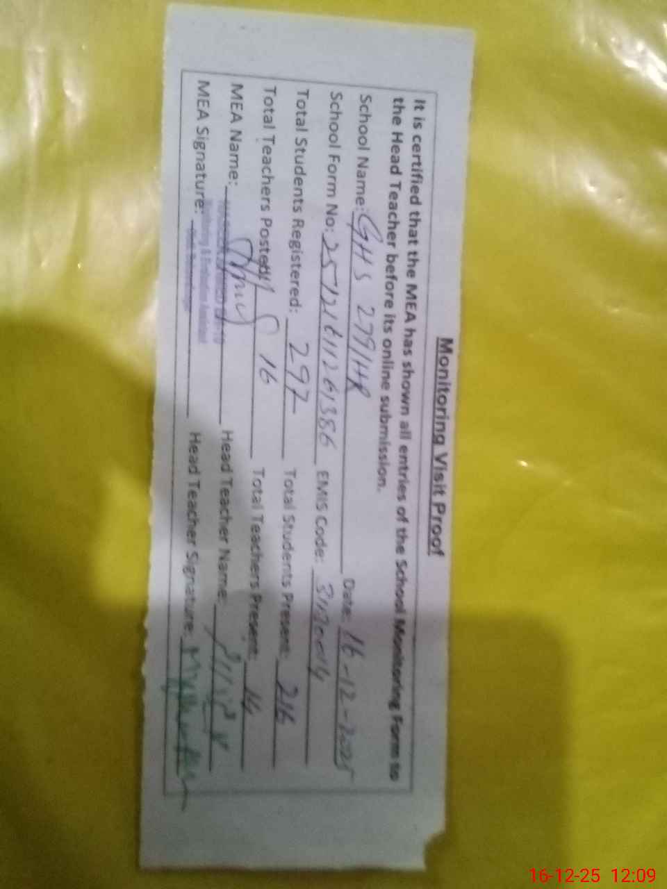 | Attendance Register | Head Teacher | MEA with School | Visit Proof |