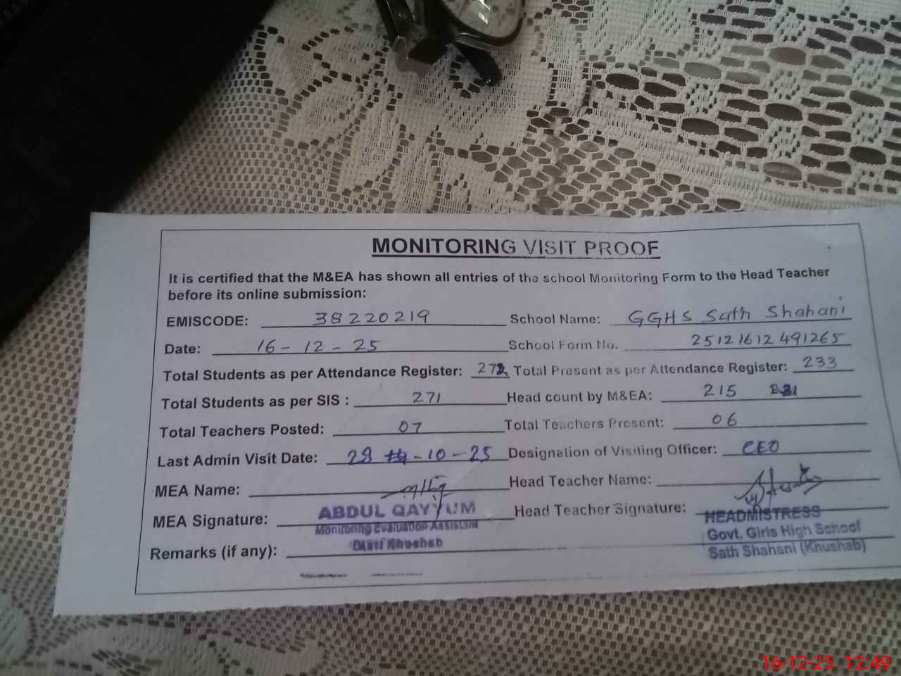 | EMIS Code: 38220219 | Name of School: GGHS SATH SHAHANI | |||