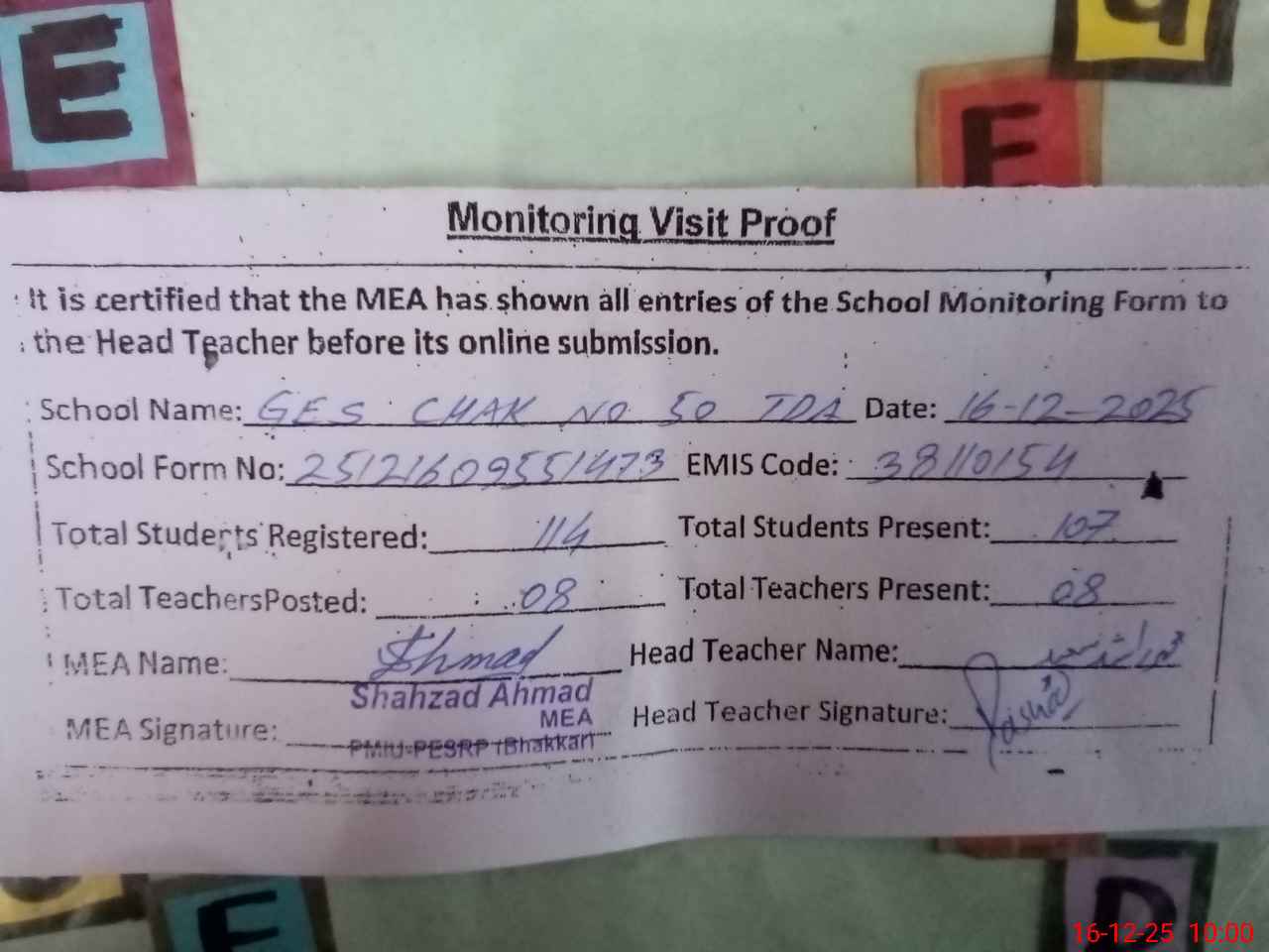 | Attendance Register | Head Teacher | MEA with School | Visit Proof |