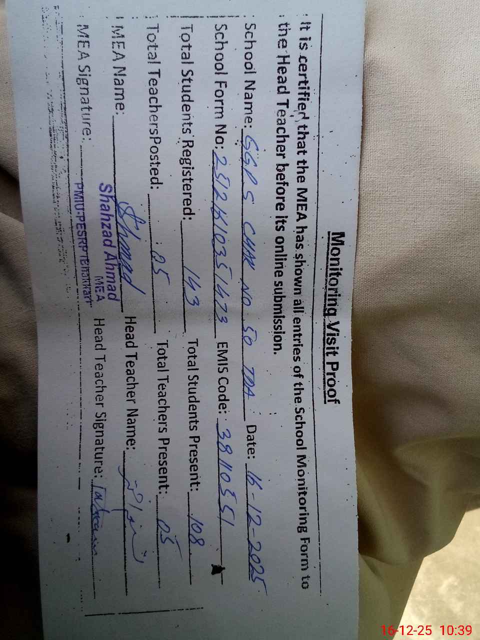 | Attendance Register | Head Teacher | MEA with School | Visit Proof |
