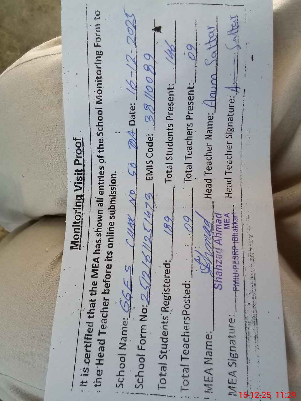 | Name: An**** Sa**** Designation: (School Headmaster's/Headmistress's) SST Phone/Cell Number: 03**** |