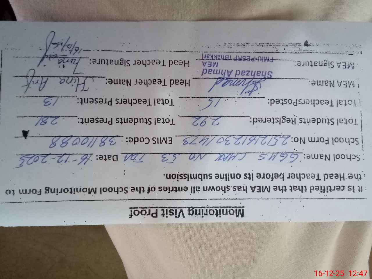 | Attendance Register | Head Teacher | MEA with School | Visit Proof |