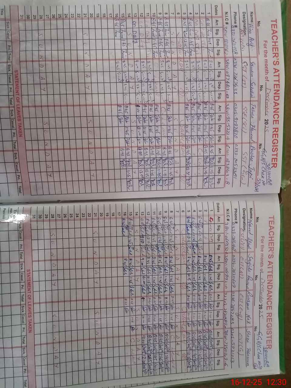 | CNIC | Full Name | Designation | R/C | Absence During Last Calender Month |