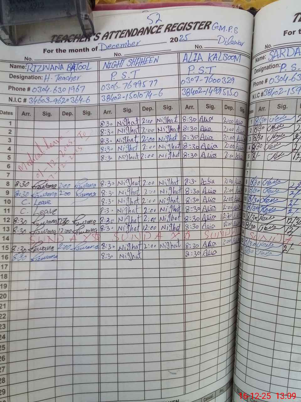 | CNIC | Full Name | Designation | R/C | Absence during last cal. month |