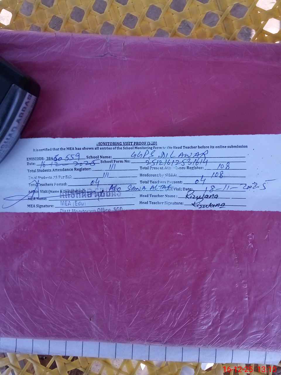 | Attendance Register | Head Teacher | MEA with School | Visit Proof |