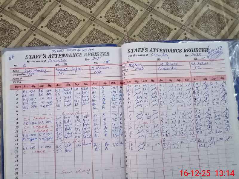 | CNIC | Full Name | Designation | R/C | Absence During Last Calender Month |