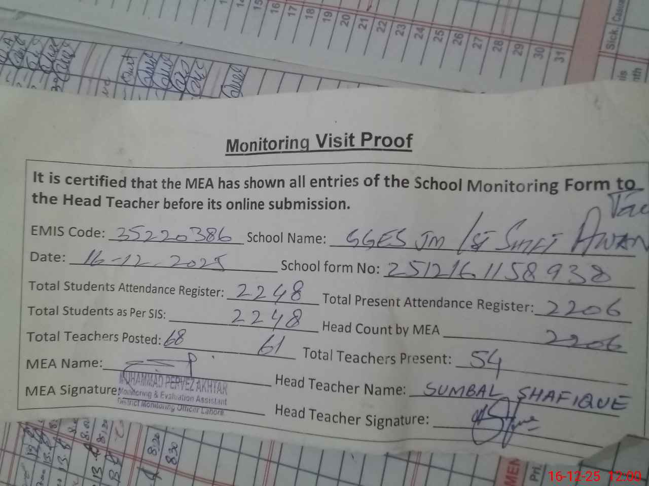 | Attendance Register | Head Teacher | MEA with School | Visit Proof |