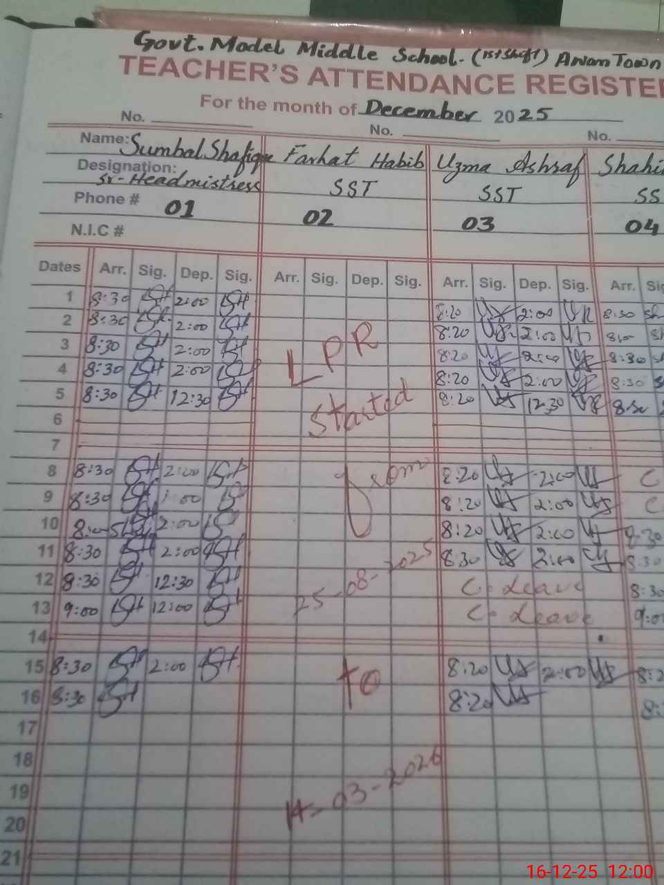 | CNIC | Full Name | Designation | R/C | Absence During Last Calender Month |