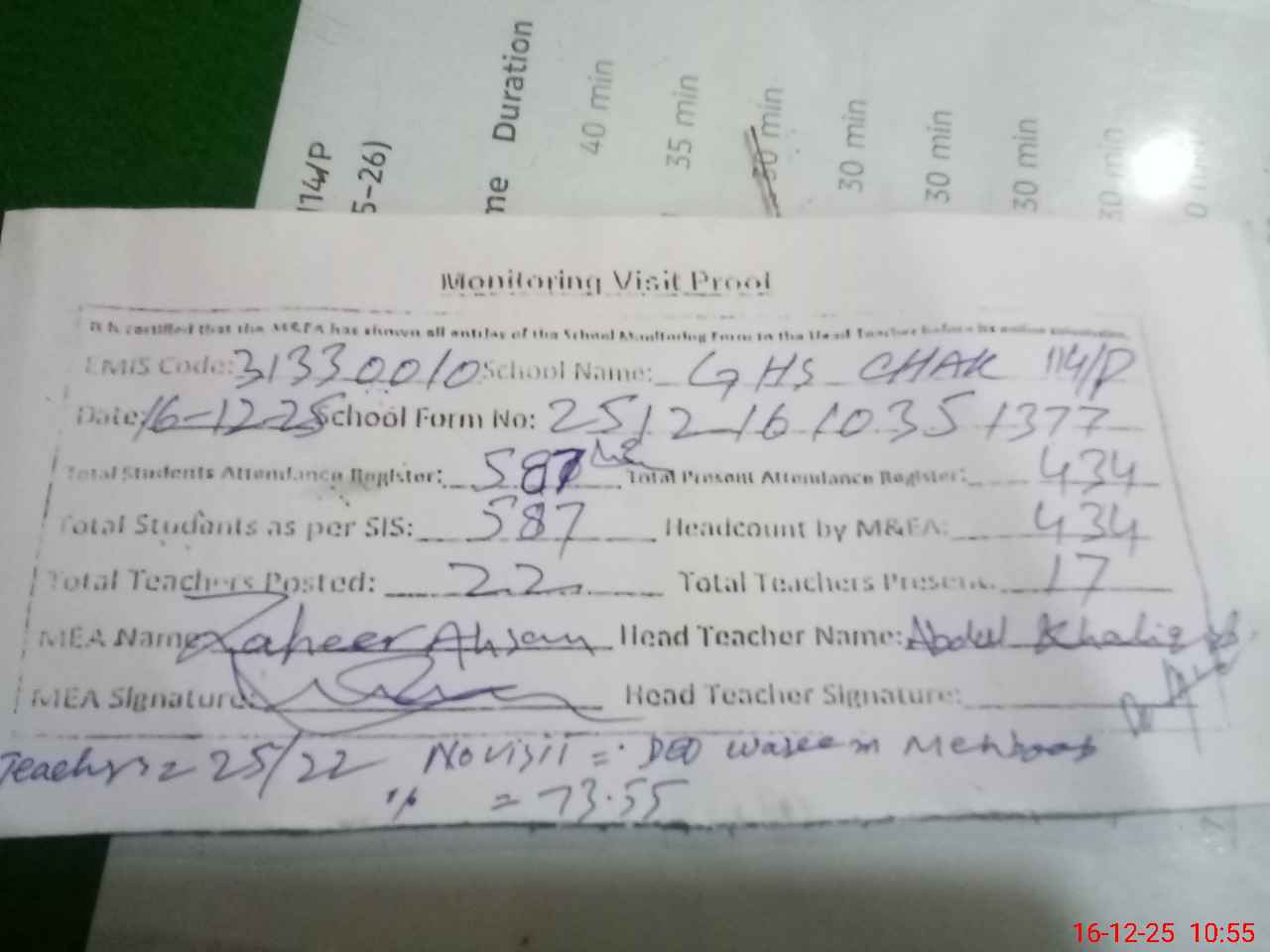 | Monitoring Date: 16-12-2025 | Start Time: 16-12-2025 09:52 AM | End Time: 16-12-2025 10:57 AM | Name of MEA: Za**** Ah**** | |