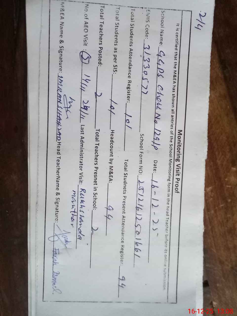 | Attendance Register | Head Teacher | MEA with School | Visit Proof |